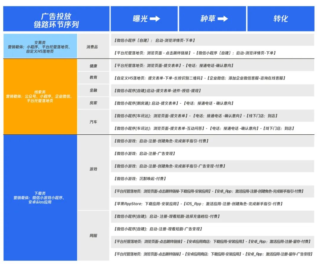 目前,营销链路已经全量上线,针对不同行业的生意特性,可以将营销链路分为三个类型来理解——交易类、线索类、下载类。并且平台预设了18条核心链路,针对个性化的需求,广告主和优化师也可以选择其他非核心链路。