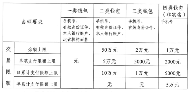 四类钱包:远程开立,仅验证手机号码,无需绑定银行账户,为匿名钱包。