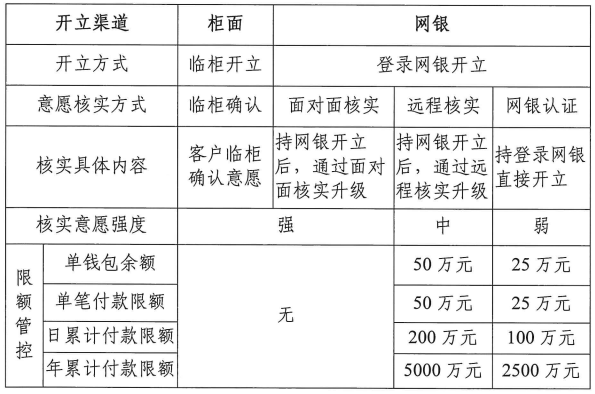 三类钱包:远程开立,需验证身份证件、手机号等信息,无需绑定银行账户,实名程度较弱。