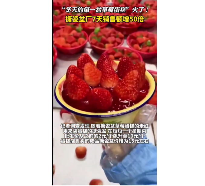近日,“冬天的第一盆草莓蛋糕”风靡全网,不仅蛋糕单生意火爆,还意外盘活了搪瓷盆厂,单价9元的搪瓷盆7天销售额暴增50倍。