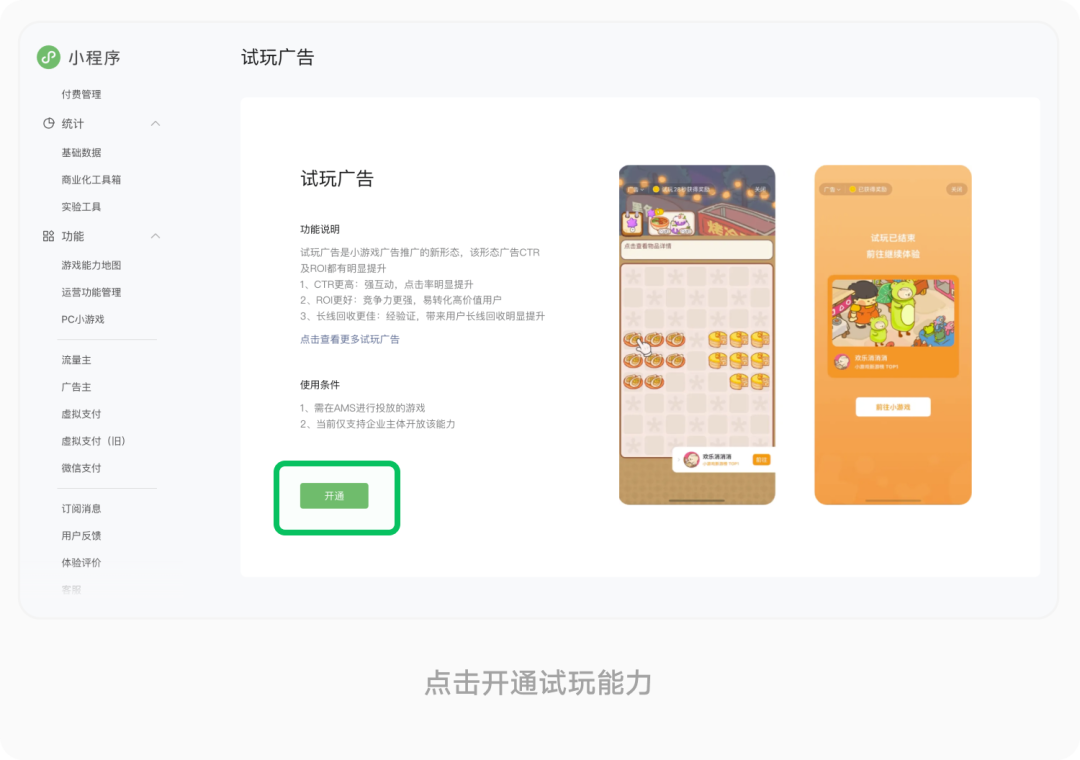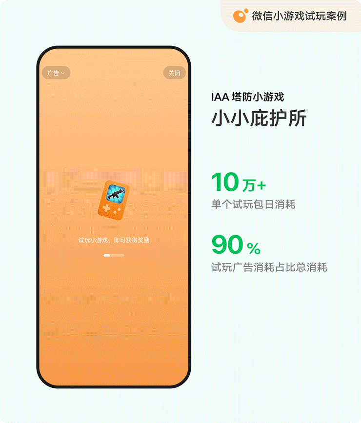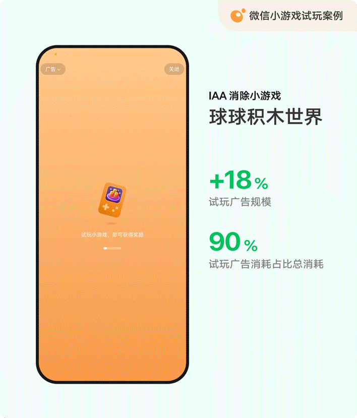 微信广告将不断优化产品运营能力,拓展增长和创新的无限可能。期待与更多广告主一起高效引入用户,创造更多收益,共享流量红利!小游戏试玩能力接入指引详见:小游戏原生试玩能力接入文档