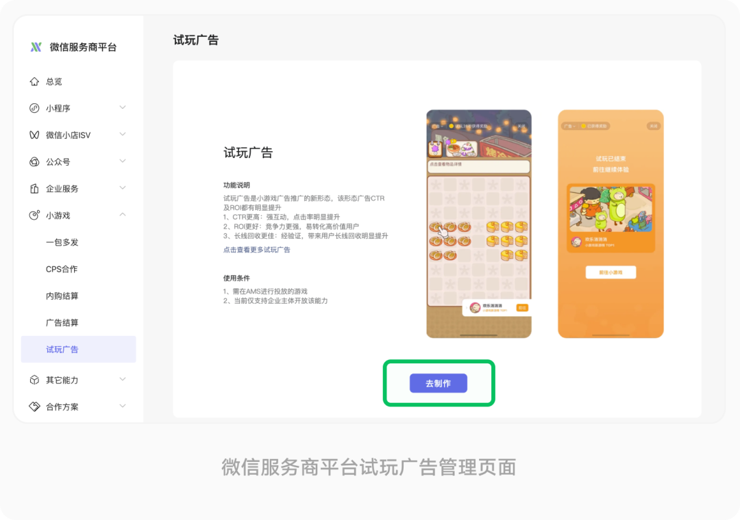 小游戏试玩广告已成为微信小游戏推广效果最好的广告形态之一,对比其他激励广告,试玩广告点击率能提升 80%,ROI 提升 30~60%。为进一步提升广告主的广告投放效率,微信广告对小游戏试玩广告能力进行全面升级。升级后,广告主可以单独制作、发布及统一管理小游戏试玩包,同时能使用 Marketing-API 批量投放以及旧版试玩包免开发迁移新版的能力,大幅提升小游戏试玩广告的制作、更新与投放效率。