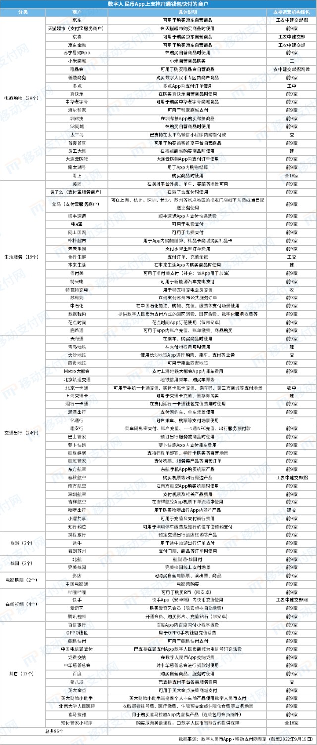 据移动支付网统计,目前数字人民币App上支持钱包快付的商户多达86个。