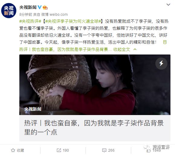 我钦佩这位姑娘。但我也蛮自豪,因为我就是她作品背景里的一个点。从今天起,像李子柒一样热爱生活,活出中国人的精彩和自信。