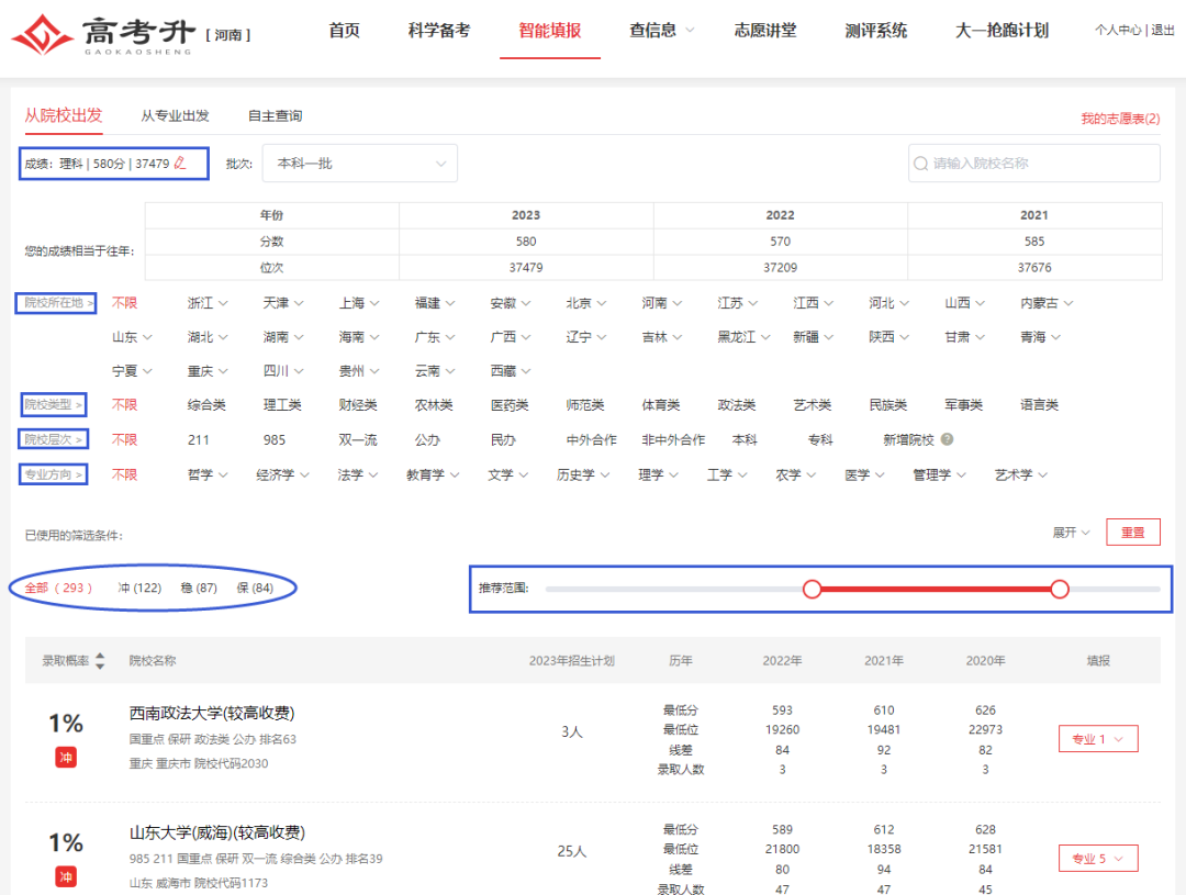 输入考生选科及成绩信息,精确筛选院校所在地、院校类型、院校层次、专业方向等范围,自行筛选分数范围,规划填报更适合考生的院校和专业,制定专属冲、稳、保志愿方案!