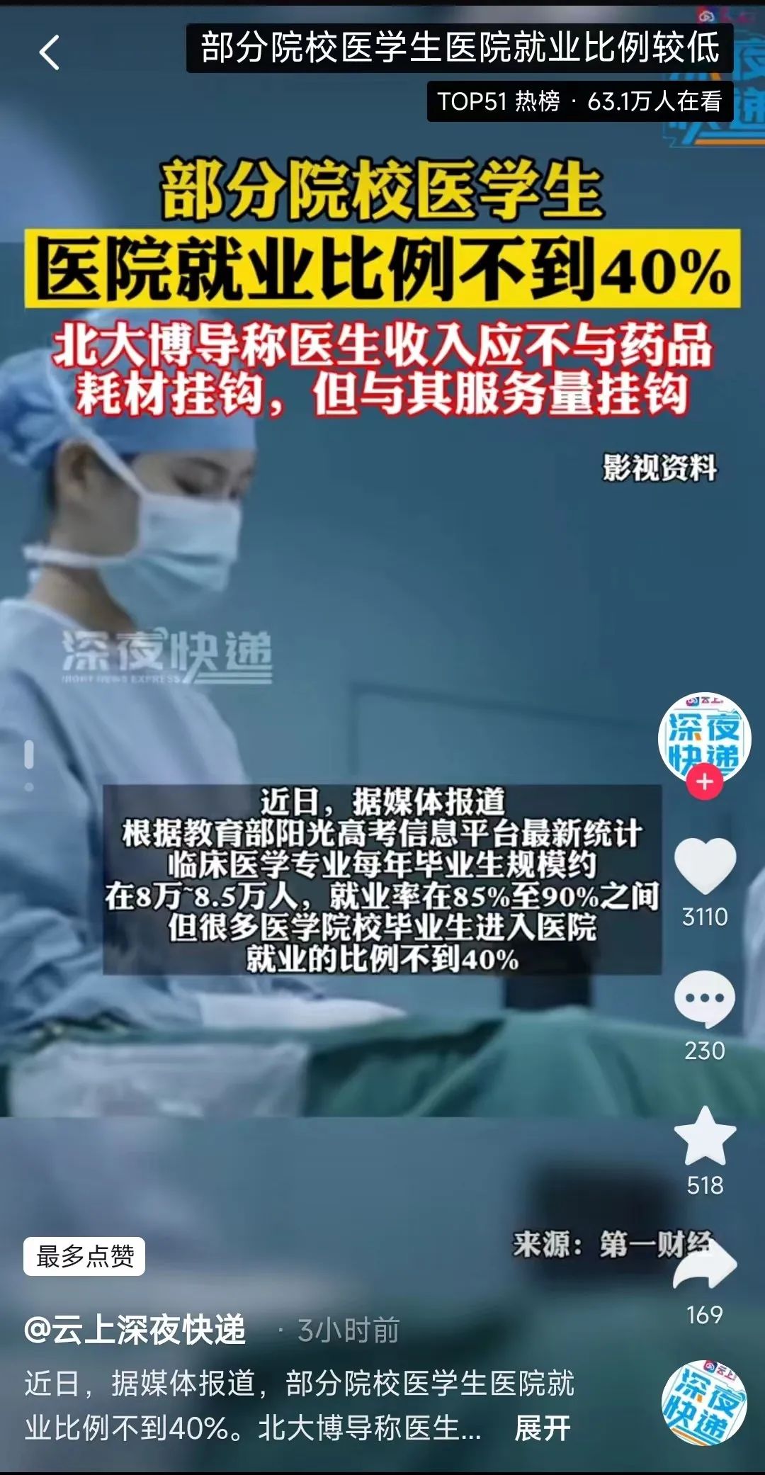 近日,据媒体报道,根据教育部阳光高考平台最新统计,临床医学专业每年毕业生规模约在8万~8.5万人,就业率在85%至90%之间。但很多医学院校毕业生进入医院就业的比例不到40%。