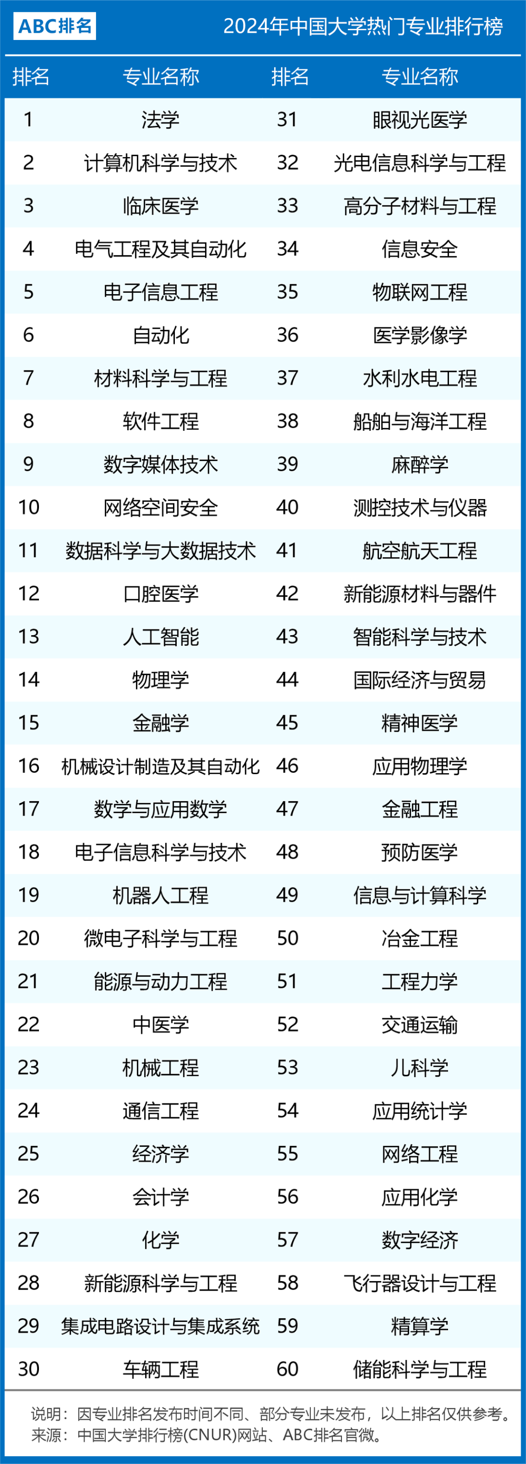 根据ABC2024年中国大学热门专业排行榜显示,2024年中国大学热门专业排行前10名分别是: