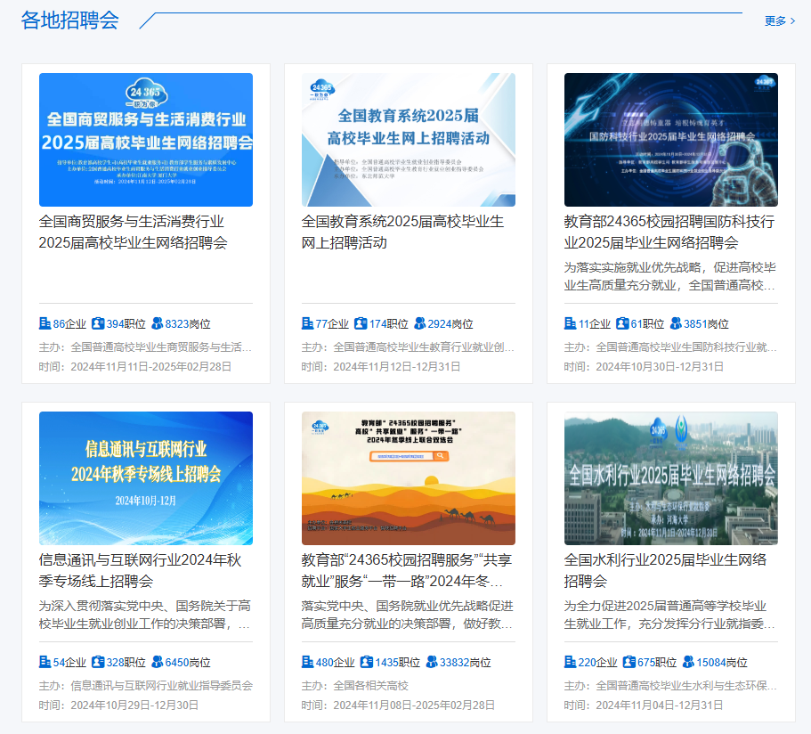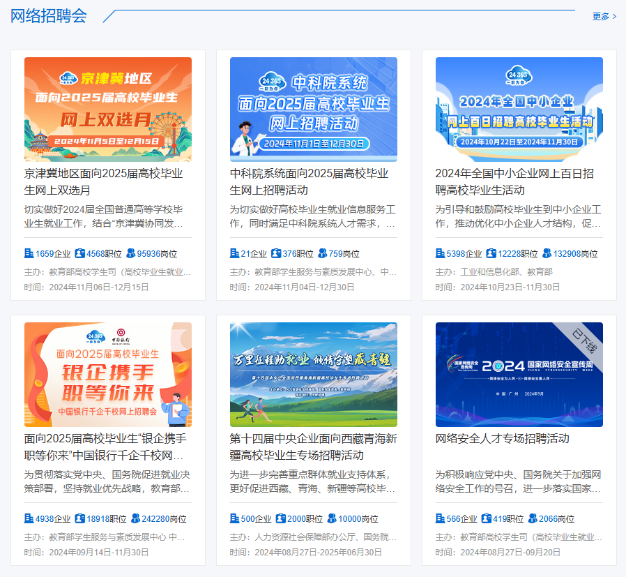 秋招,除了在简历上下功夫,渠道选的好,也是赢得offer必不可少的条件。选对路,比盲目前进更为重要!渠道一:国家大学生就业服务平台(https://www.ncss.cn/)国家大学生就业服务平台是由教育部主管、教育部学生服务与素质发展中心服务于高校毕业生及用人单位的公共就业服务平台,专注于为大学生提供就业资讯和就业服务,目前,有许多专场招聘活动还未结束,如“京津冀地区2025届高校毕业生网上双选月”、“2025届高校毕业生中国银行千企千校网上招聘会”等,这些招聘专场提供10万+岗位,大家要抓紧机遇,多多网申!