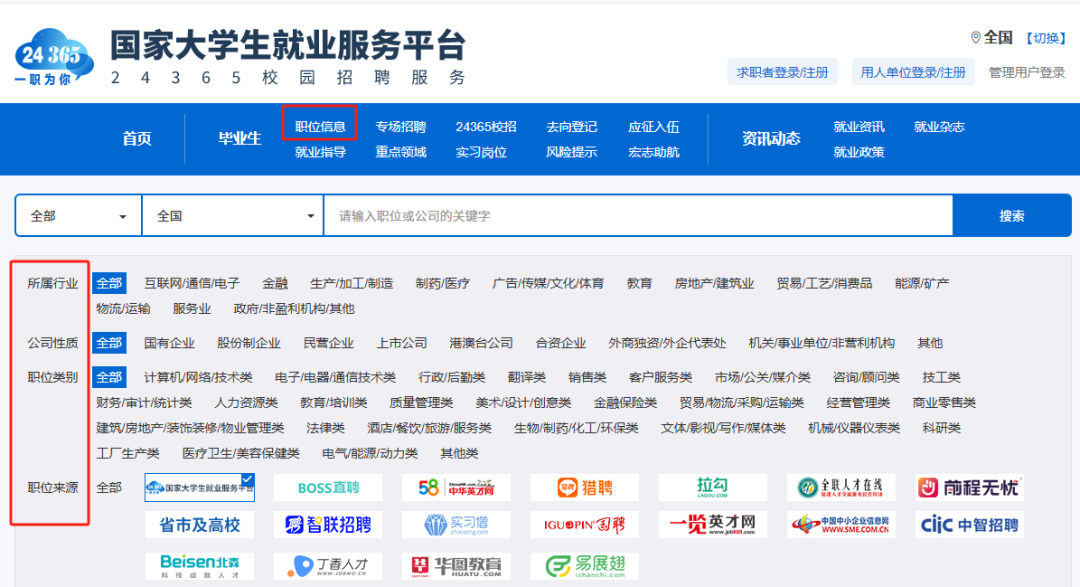 除专场招聘外,该平台还有来自十余家常见招聘软件的招聘信息,可根据行业、性质和岗位类别进行筛选;在就业指导专栏,涵盖大学生特岗、公务员考试、科研助理岗、校园招聘等众多专题。