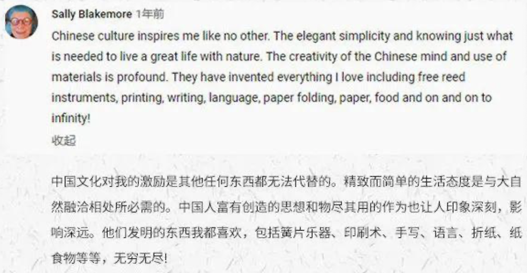“伟大的中国文化。” “中国几千年的文化在一个非凡的女孩身上重现,我虽然不是中国人,但我为她感到由衷的骄傲和高兴。” “中国人富有创造的思想和物尽其用的作为让人印象深刻,影响深远。” “她在重新向全世界介绍被我们忘记的那些中国文化、艺术和智慧。”