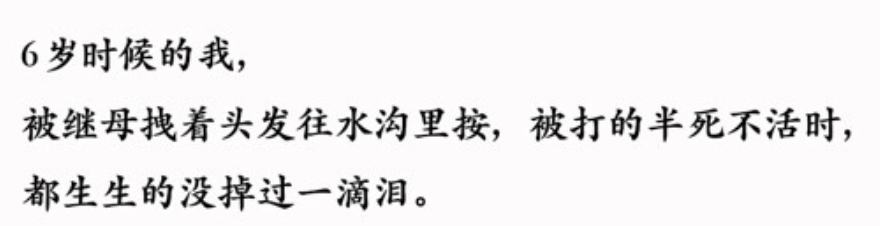 “6岁时候的我,被继母拽着头发往水沟里按,被打得半死不活时,都生生的没掉过一滴泪。”