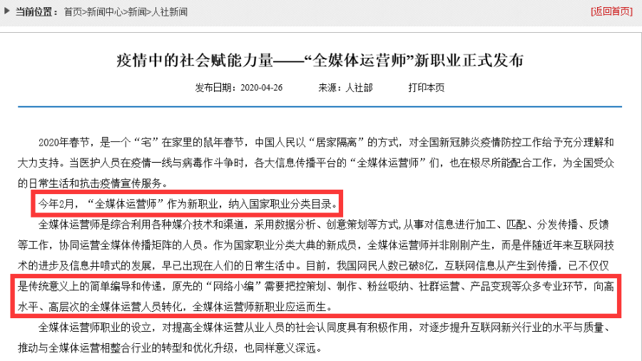 2020年2月25日,人力资源社会保障部与市场监管总局、国家统计局联合向社会发布了16个新职业,其中“全媒体运营师”作为传媒行业唯一新发的黄金职业正式问世,并被纳入《中华人民共和国职业大典》,职业编码:4-13-05-03!