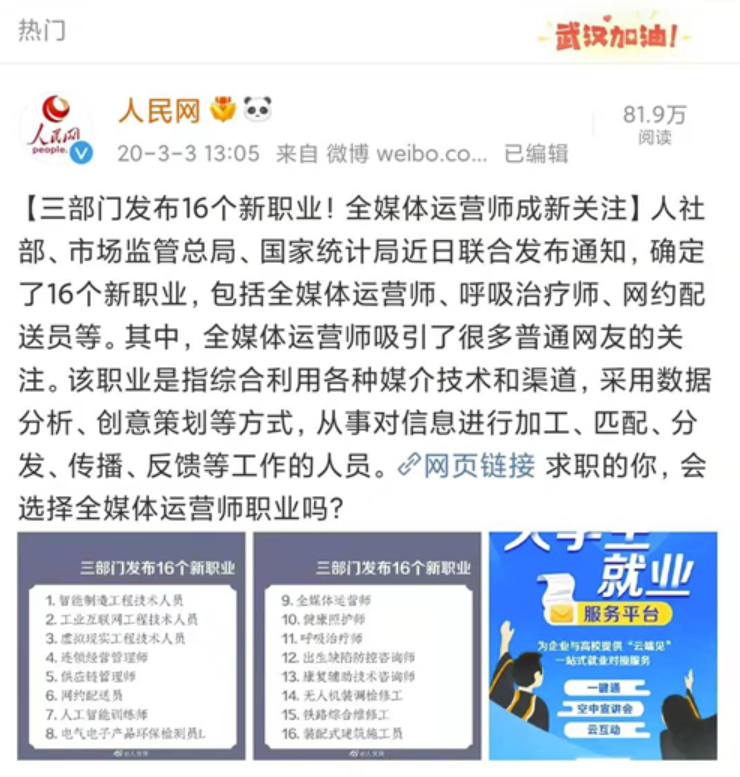全媒体运营师作为2020年国家发布的全新职业,受到社会的广泛关注,人民网官微点名鼓励大家学习全媒体运营师。