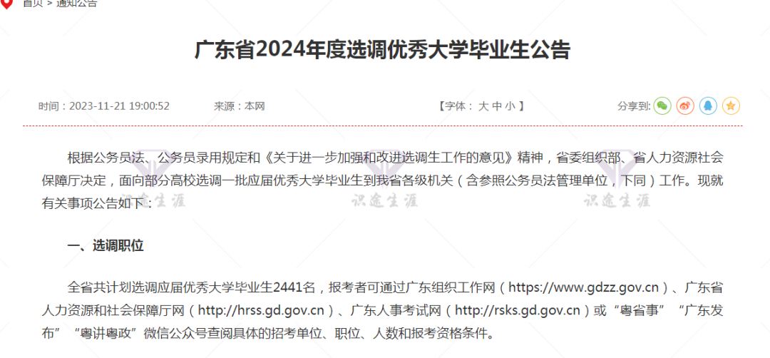 近日,广东省2024年度选调优秀大学毕业生公告发布,全省共计划选调应届优秀大学毕业生2441名。