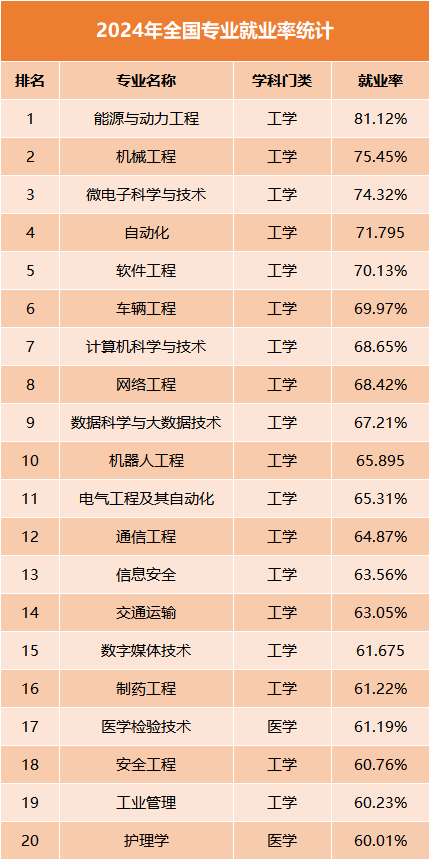 2024就业率排名前20专业情况