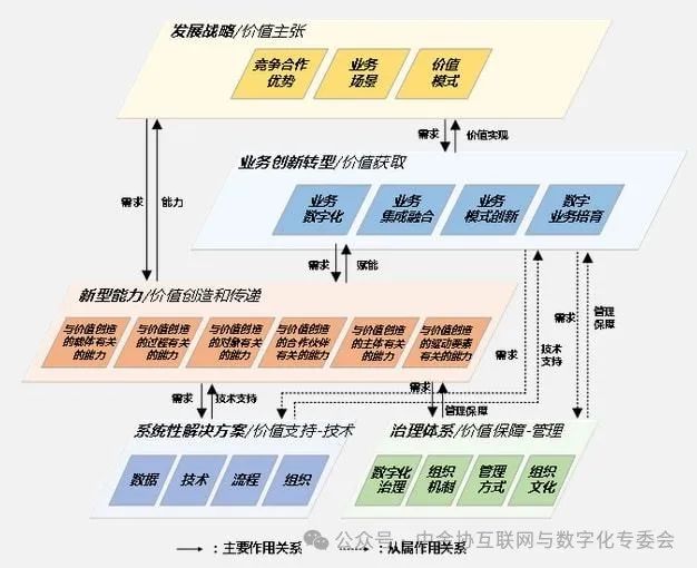 根据数字化转型的新形势、新趋势和新要求,发展战略视角提出新的价值主张。根据价值主张新要求,新型能力视角打造支持价值创造和传递的新型能力(体系)。系统性解决方案视角创新价值支持的要素实现体系,形成支持新型能力打造、推动业务创新转型的系统性解决方案。治理体系视角变革价值保障的治理机制和管理模式,构建支持新型能力打造、推动业务创新转型的治理体系。根据价值主张新要求,基于打造的新型能力(体系)、形成的系统性解决方案和构建的治理体系,业务创新转型视角形成支持最终价值获取的业务新模式和新业态。