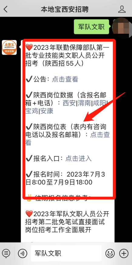 点击下方名片,进入【本地宝西安招聘】公众号,在对话框中回复【军队文职】即可直达报名入口/获取详细岗位表/报名咨询电话/随时追踪军队文职最新招聘信息!