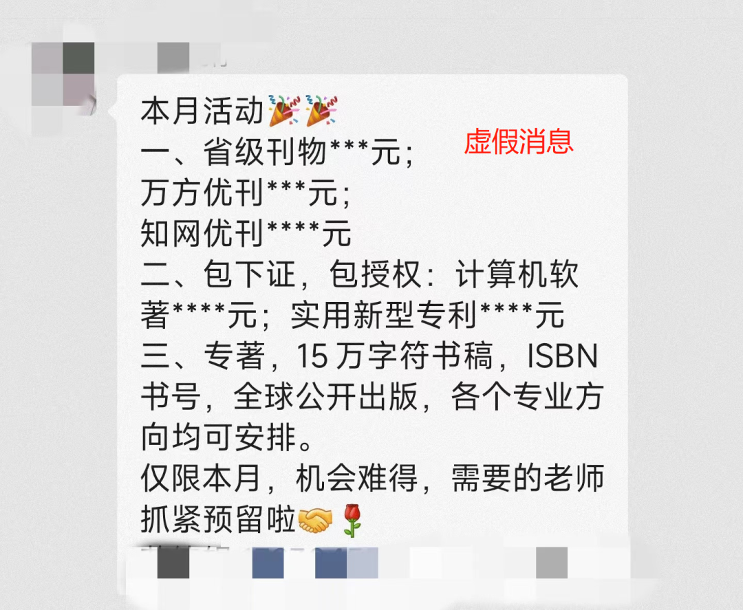 不要相信那些自称认识期刊编辑、鼓吹花几千到几万就可以在核心期刊帮你发表论文的”神通广大人士“。在一些群聊或是朋友圈看到论文投稿的广告,均不能轻信。