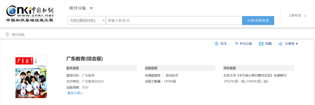 这里,小媒君以中国知网为例,首先登录中国知网,选择期刊导航版块,在搜索框输入《广东教育》。