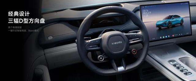 小米SU7 的方向盘、座椅、仪表屏、HUD、全部中轴对称。经典的运动方向盘,握感舒适,拥有两个物理按键,一键开启智能驾驶,一键开启 Boost 模式,方便快捷。
