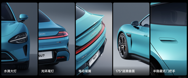小米SU7 拥有属于自己的家族设计特征:水滴大灯、光环尾灯、电动尾翼、涟漪曲面和半隐藏式门把手。