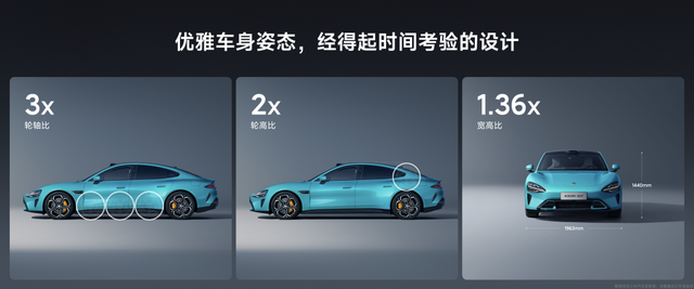 小米SU7 是一款C 级豪华科技轿车,有着黄金比例的轮轴比、轮高比、宽高比。侧面,轮廓线优雅;正面,低趴的姿态冲击力十足;正侧方,流畅饱满的车身曲线与极具张力的前轮包设计完美协调;尾部,别具一格的小翘尾和光环尾灯设计,极具辨识度。