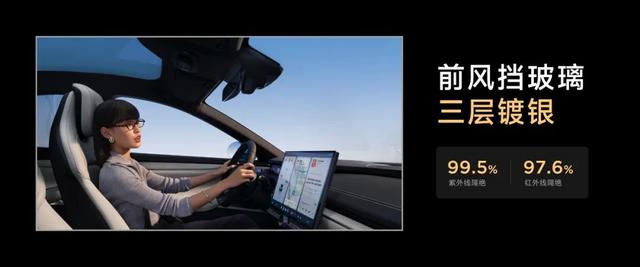 小米SU7 整车玻璃面积达到 5.35㎡,超大的天幕玻璃采用双层镀银,紫外线隔绝 99.9%,红外线隔绝 99.1%。前风挡玻璃则采用三层镀银,紫外线、红外线隔绝率非常出色,我们是唯一采用三层镀银前风挡的轿车。