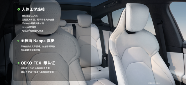小米SU7 采用环绕式座舱设计,C 级乘坐空间,前后排都不会感觉压抑。座椅是一体式运动风格,填充高密度发泡和记忆海绵,还选配了全粒面 Nappa 真皮,手感柔软舒适、健康环保。