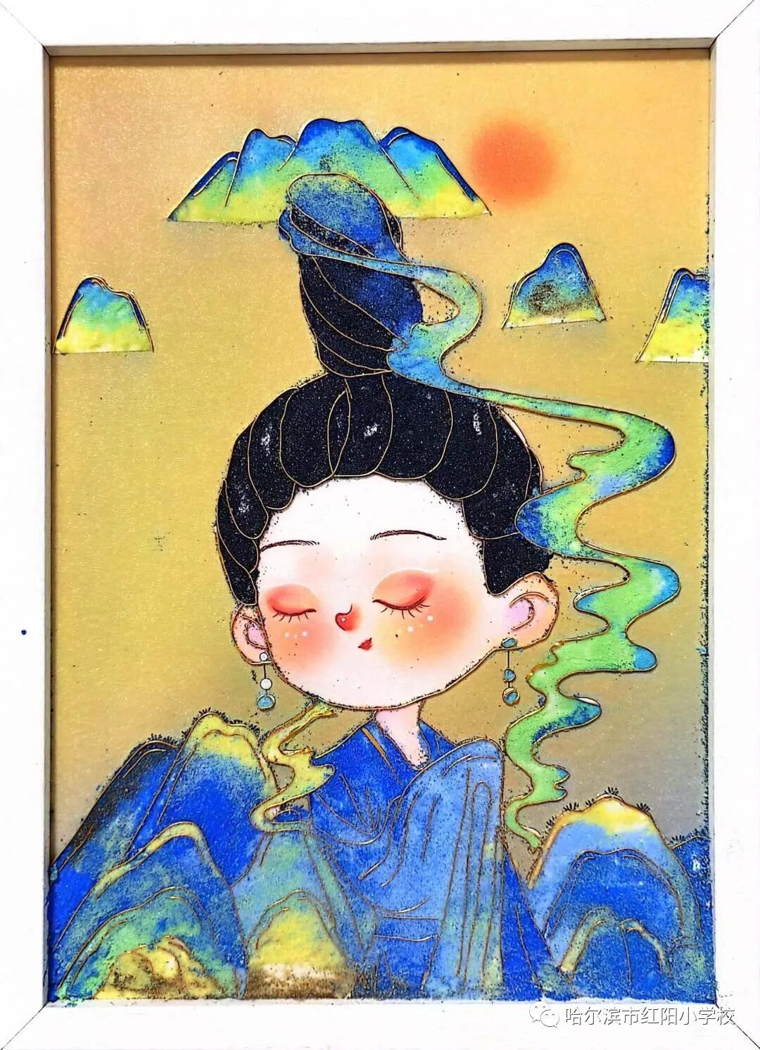 画面修整好后上胶水,等它彻底风干,一幅精美的掐丝珐琅画才算完成。