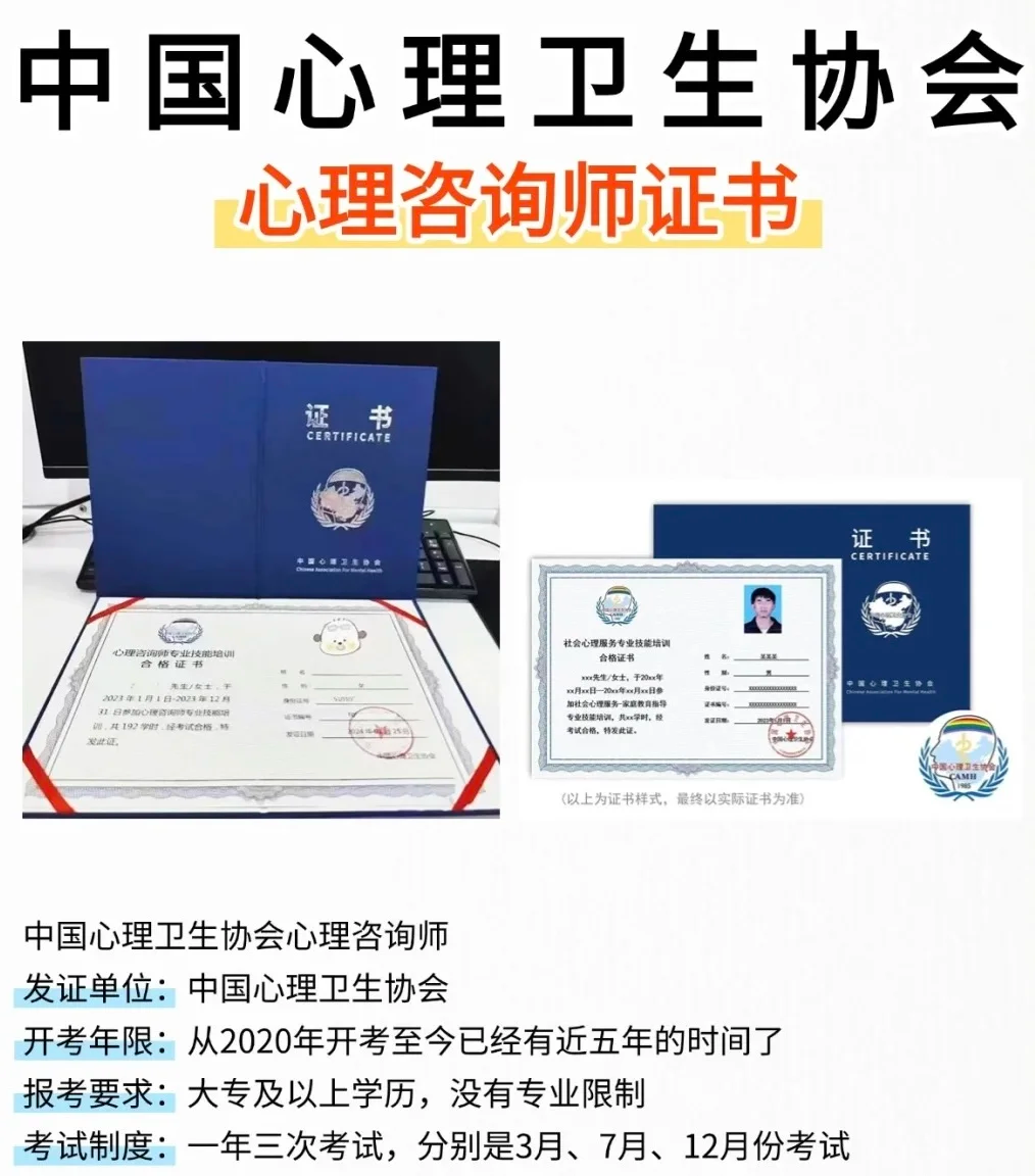 2017年心理咨询师资格证取消后,中国心理卫生协会作为原人社部心理咨询师职业考试的技术支持单位,根据社会各界对心理咨询专业人才的需求,依托自有专家团队和师资力量,依照国家《心理咨询师国家职业标准》,推出了心理咨询师专业技能培训项目,考核合格颁发培训证书。