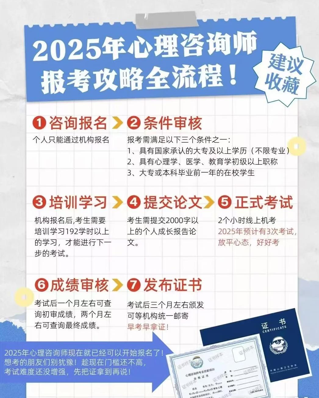 2025年心理咨询师考证步骤共六步,大致如下: