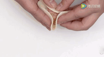 双手托住饺子皮,大拇指和食指对称,同时向饺子中间捏紧。