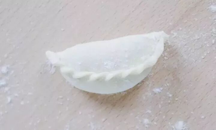 将饺子封口折成半圆形,用拇指把饺子顶端往下捏薄,最后捏成一条完整的绞边纹,看起来不是很难,但就不知道会不会容易露馅。