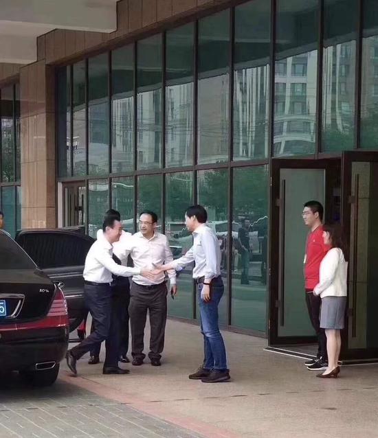 这一次,王健林衣着正式,刚下车门,身子微向前倾,伸出右手。雷军则穿牛仔裤,显得轻松,照片定格在两人还未及握手的瞬间。