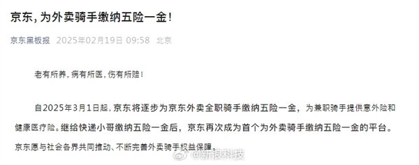 2月19日,京东再度宣布,自2025年3月1日起,京东将逐步为京东外卖全职骑手缴纳五险一金,为骑手提供意外险和健康医疗险。
