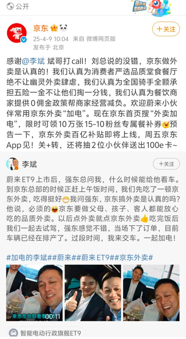 4月9日,蔚来创始人李斌 @李斌 在微博发布和京东创始人刘强东的互动视频,并配文,随后“李斌和刘强东一起吃外卖”话题登上微博热搜,引发网友关注。