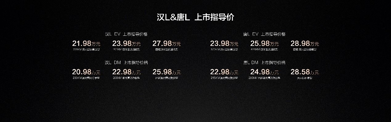 以超级e平台全域千伏架构,汉L EV重新定义中高端纯电旗舰的技术标准,让20万以上的主流纯电,正式进入兆瓦闪充、油电同速的新时代!汉L DM标配第五代DM技术,可满足用车强度更高的用户所需,让工作与生活更好平衡。同时,汉L全系标配智能底盘、天神之眼 B高阶智驾、DiLink 150高阶智舱,实现智电融合。此外,汉L采用Loong Face龙颜美学,并坐拥旗舰豪华大满配,更以全球五星安全标准为基底,缔造全维安全。以比亚迪“划时代技术矩阵”领衔,汉L全面展现划时代旗舰轿车风范!